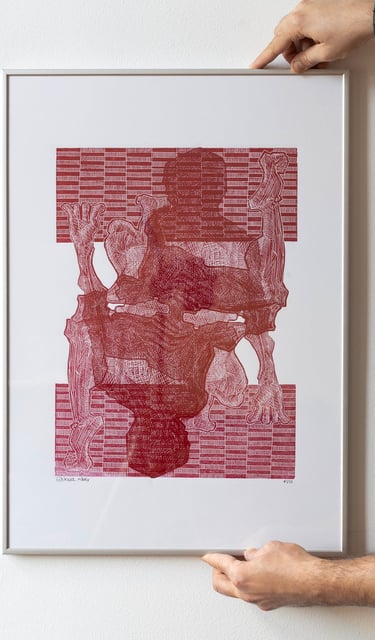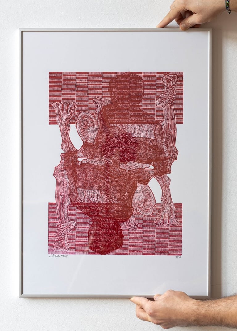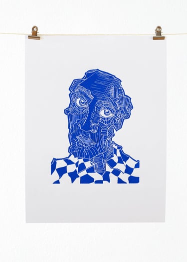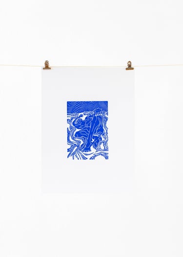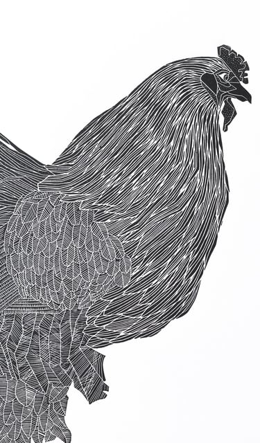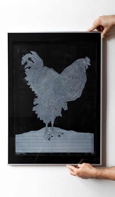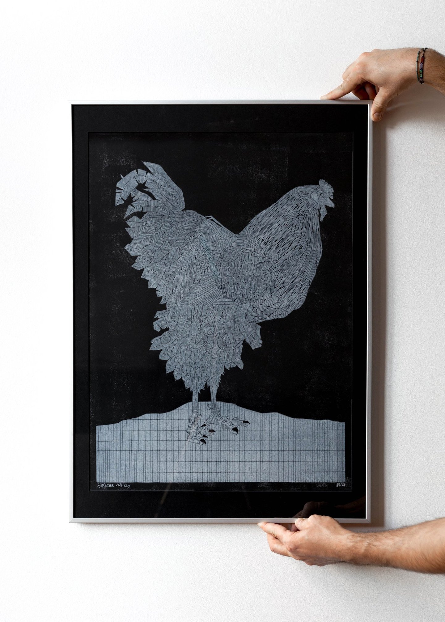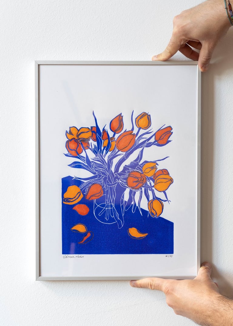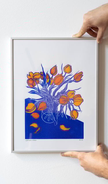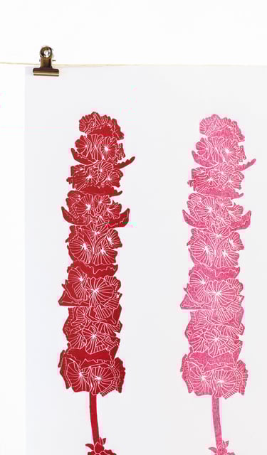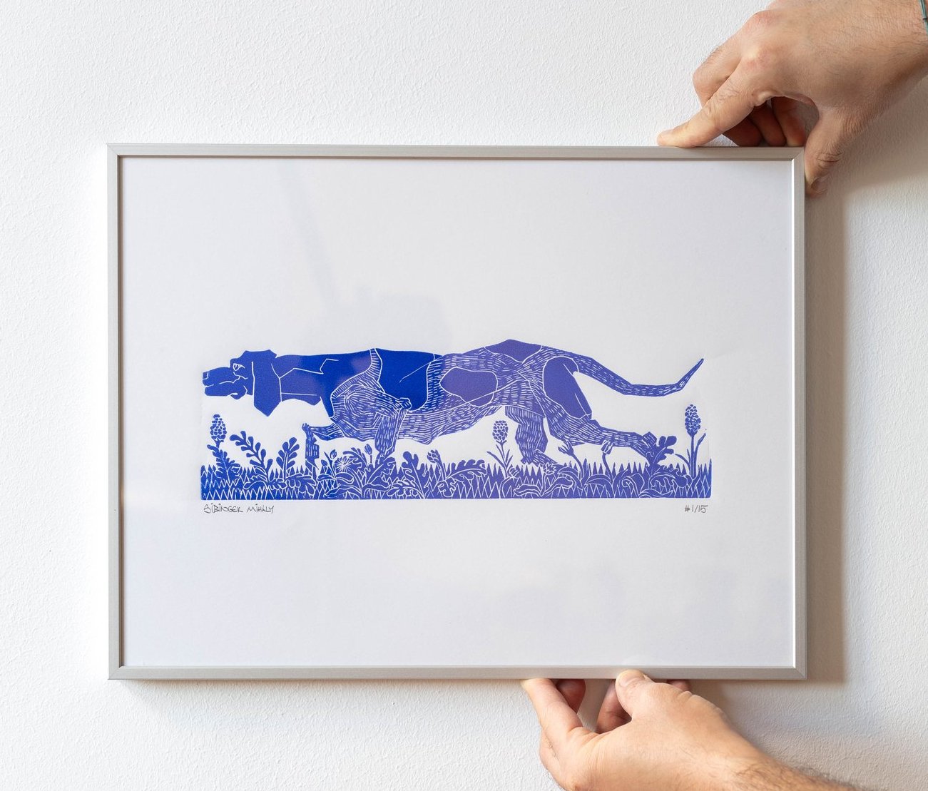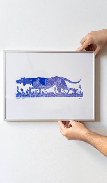 The pictures are hand-carved and hand-printed lino prints, created with high-quality oil colors and the finest quality, acid-free art paper.